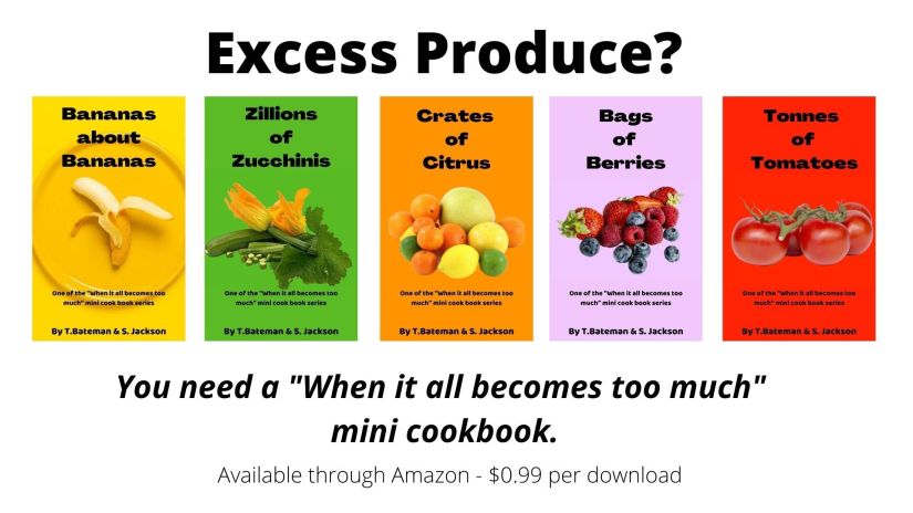 "Bags of Berries", "Crates of Citrus", "Tonnes of Tomatoes", "Zillions of Zucchinis", $1 books, Cook book, E-books, When it all becomes too much, ZucchinisNew titles added to $AU0.99 Mini Cookbook range November 28, 2020November 2, 2020 sarahjwrites Find these books through Amazon: “When it all becomes too mucb” Share this: Click to share on Facebook (Opens in new window) Facebook Click to share on X (Opens in new window) X Like Loading... Related