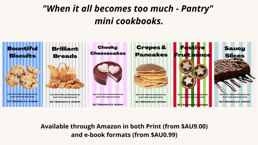 “Crepes & Pancakes” is the sixth book in the “When it all becomes too much” mini cookbook pantry series by Terri Bateman & Sarah Jackson. This easy-to-use book contains some useful baking information and 22 easy-to-make recipes to help you make some impressive crepes and pancakes.   (Yes, we usually only have 20 recipes in a book, but we couldn’t decide what to leave out).